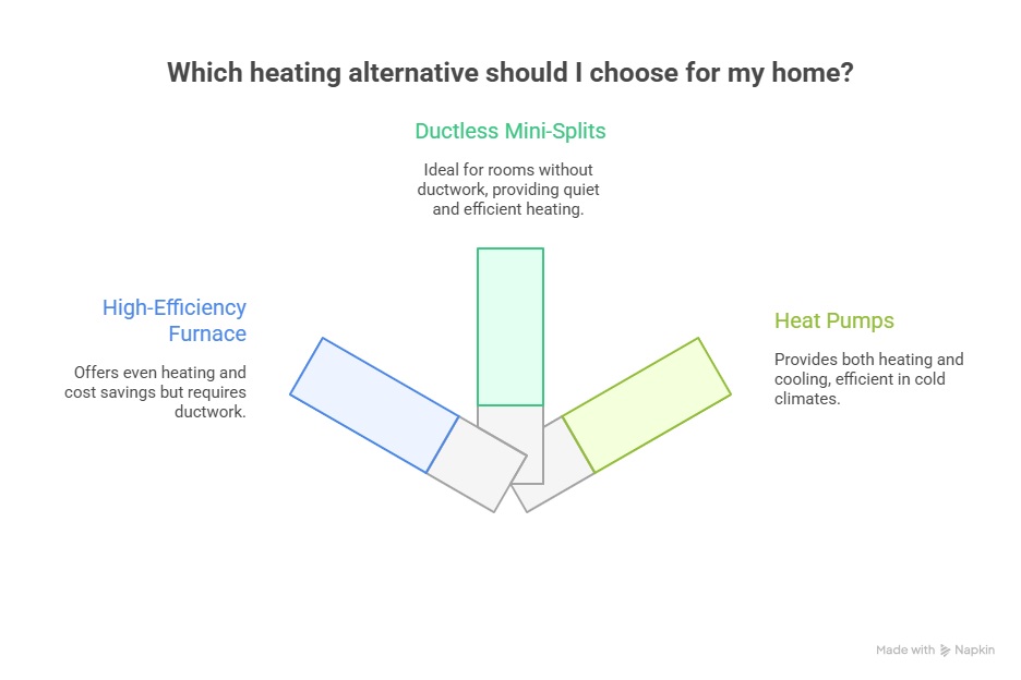 If you find yourself depending on a space heater because your central system isn’t keeping up, it’s a sign that your home may need a long-term solution. Space heaters should be temporary, not your main source of warmth. Consider these safer, more efficient alternatives: